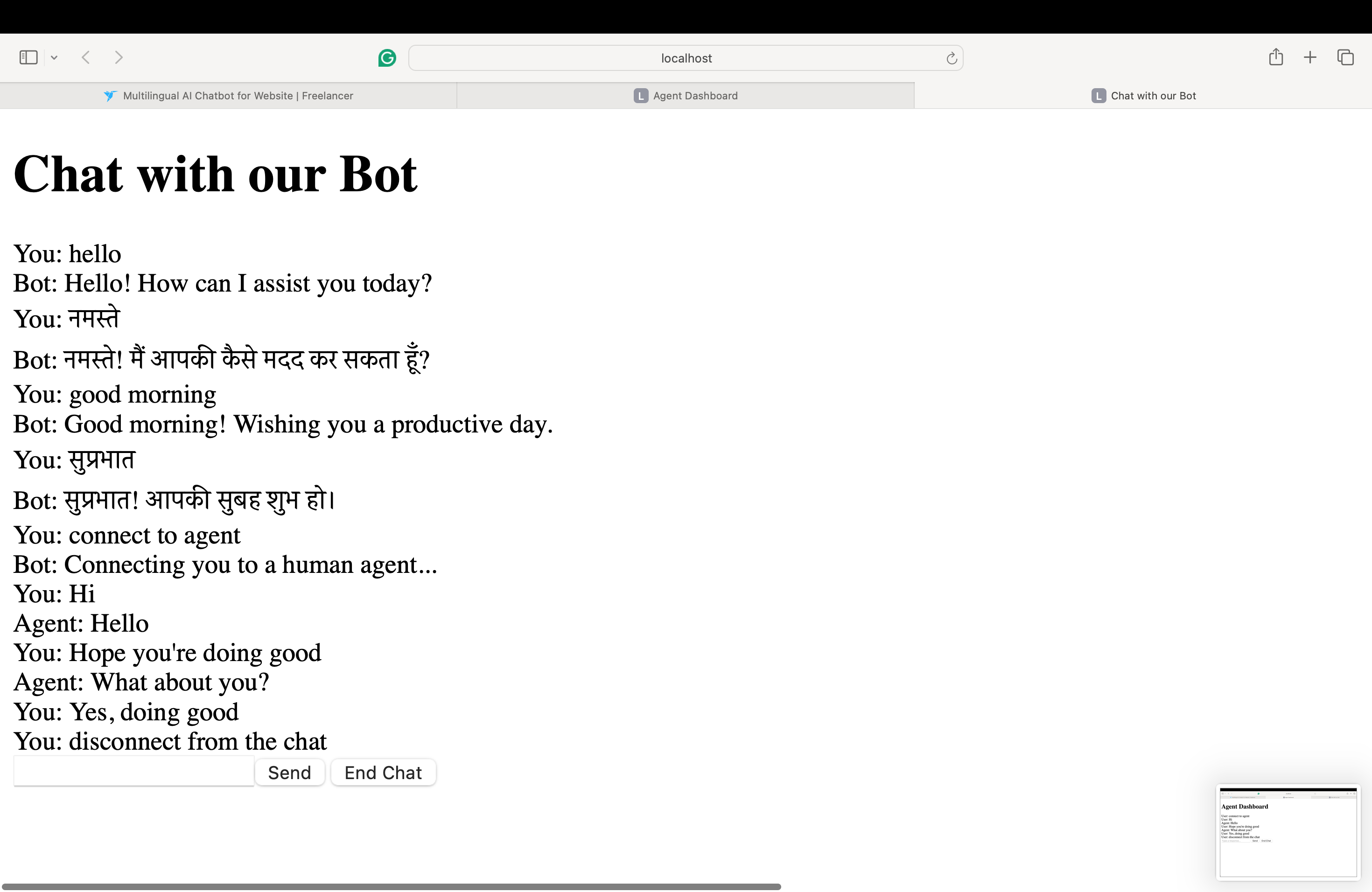 I successfully developed a Generative AI-driven Multilingual Chatbot tailored for website integration. The chatbot leverages cutting-edge AI to provide real-time, context-aware responses based on website content. It seamlessly handles multilingual conversations in Hindi and English and can transition to a human agent when necessary.