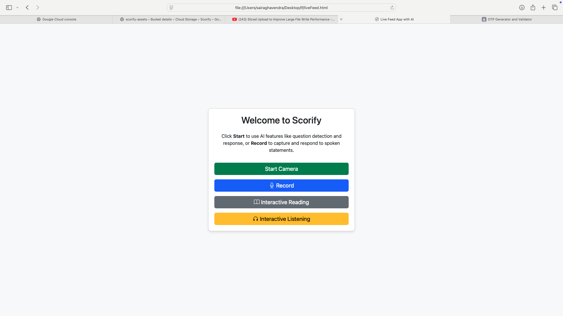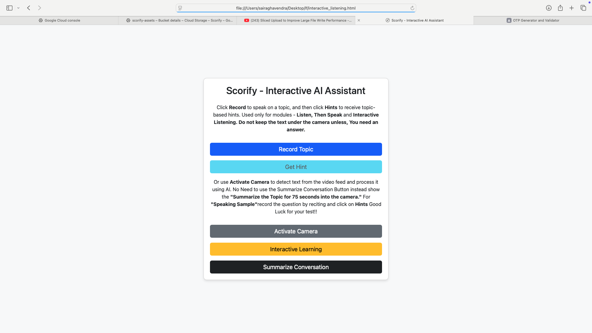 Scorify is an AI-powered application designed to assist users with interactive learning, test preparation, and real-time question detection. Built with cutting-edge AI integrations, Scorify offers multiple features like Interactive Reading, Interactive Listening, and OTP Validationfor secured access. Core Functionalities AI-Powered Text Detection: Utilizes Google Vision API for extracting text from images or video feeds. Processes text dynamically to generate meaningful and context-based answers. Speech Recognition: Implements browser-based SpeechRecognition API for real-time transcription. Records and processes user speech to generate hints or summarize conversations. Audio Output: Uses speechSynthesis to provide audio responses for answers, summaries, or hints. Dynamic Hint Generation:…